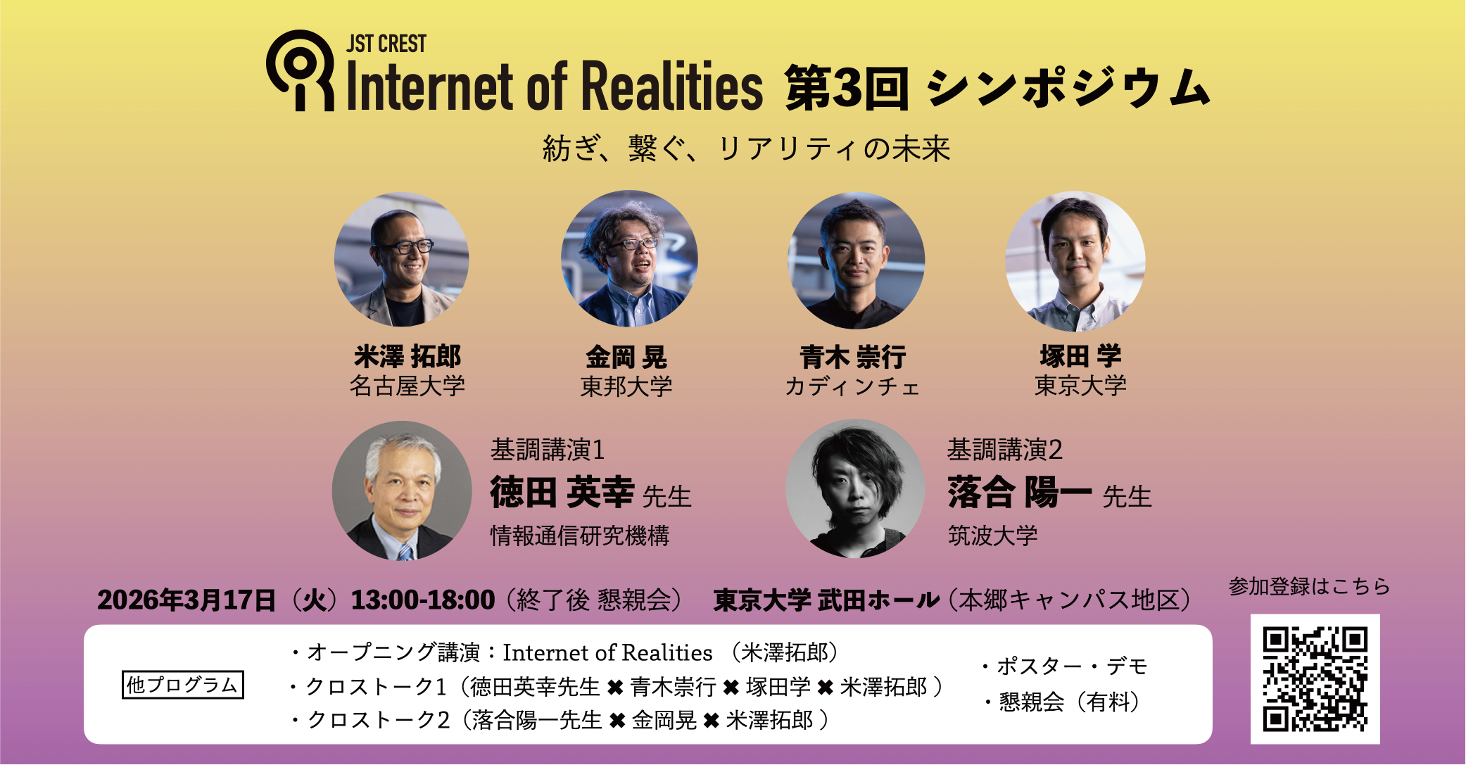 本シンポジウムでは、プロジェクト研究者による取り組み紹介に加え、分野を牽引してきた研究者/ビジョナリーによる基調講演、プロジェクト研究者とのクロストーク、そして次世代研究を担う若手・学生によるポスターセッションを開催します。技術・デザイン・都市・福祉・メディア・教育など多様な領域が交差するIoRのテーマを、多様な立場の参加者が“自身のリアリティ”から語り合うことで、新たな共通基盤や協働の可能性を拓くことを目指します。IoRの理念を社会にひらき、研究者・実践者・市民が共に未来のリアリティを構想する創造的な交流の場となることを期待しています。
